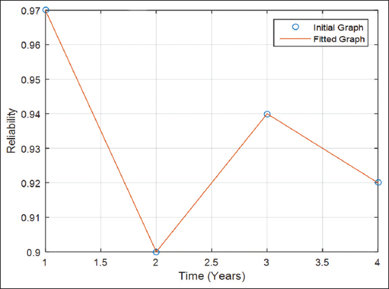 The monthly reliability of the relay for the year 2017 is predicted using its mathematical model which is achieved through simulation of its Simulink model with the appropriate input values. Table 1 shows the predicted values of the reliability for January–December 2017 [Table 2 and Figure 2].
