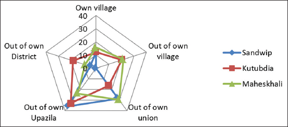From the survey, the authors identify that most displaced people acquired shelter in diverse areas such as Government Khas land (roadside without formal permission), government land (with temporary ownership from second parties), on the coastal embankment. These people made temporary houses on both sides of the embankment, and few respondents remake their houses on their individual land. It was found that livelihood and living situations of study areas inhabitants are Nomadic’ nature and so vulnerable for their life. Due to weak embankment and strong wave, Sandwip people habituated for unstable their houses frequently. Hence, inhabitants of Sandwip not able to stay more than 2 years endlessly compare to other two Islands [Figure 3].