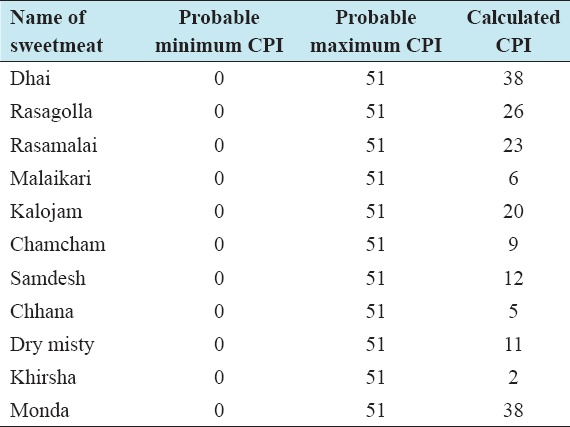 Table 4: Classification of sweetmeats on the basis of CPI for all the respondents