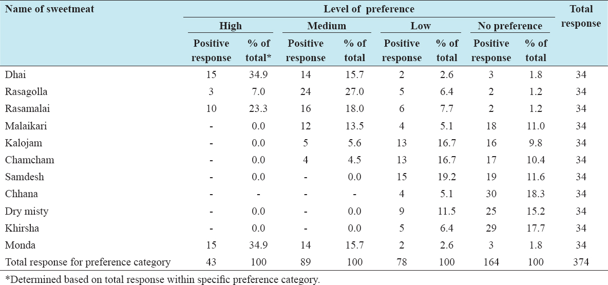 Level of preferences to different sweetmeats by respondents of all ages is given in Table 2. Table 2 represents that Dhai was the top among the highly preferred sweetmeat products (41% of responses), more than 27% of responses showed medium preference for Rasagolla and more than 16% of the respondents said that they had no preference for each of Chana or Khirsha.