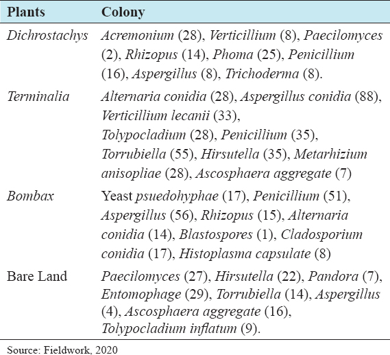 The study shows that there was no significant difference between the fungi diversities across the different plots (P≤0.05) [Table 3]. The Fungi diversities under Dichrostachys, Terminalia, Bombaxand on bare ground were not significantly different (P≤0.05) [Table 4] with means values as shown in Figure 1.